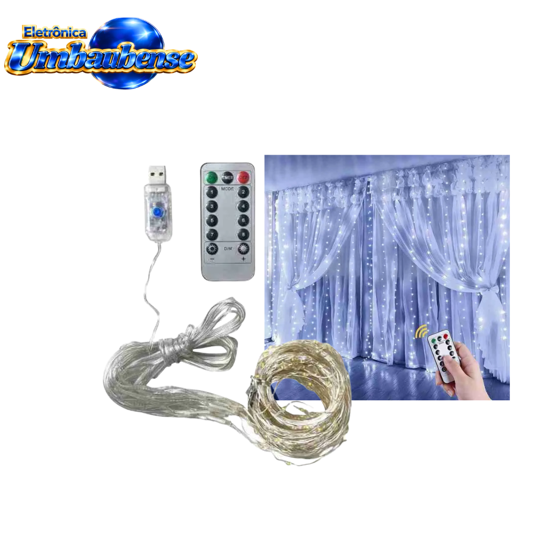 Com 300 LEDs de alto brilho distribuídos em fios de cobre flexíveis, ela forma uma linda cascata de luz uniforme, valorizando paredes, janelas, painéis e cenários fotográficos.